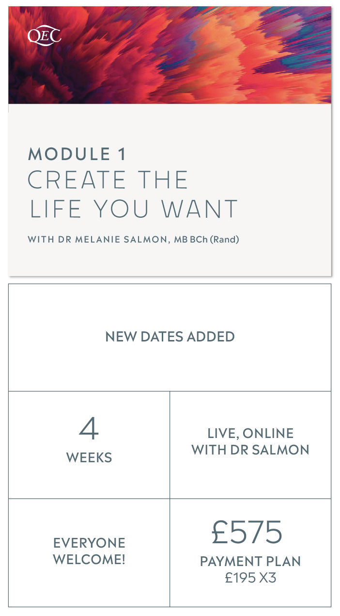 Learn the fundamentals of the modality, so that you can use QEC as a self-help tool in all aspects of your daily life. A team of dedicated supervisors will guide and support you throughout. All teaching sessions are presented live with QEC founder, Dr Melanie Salmon.